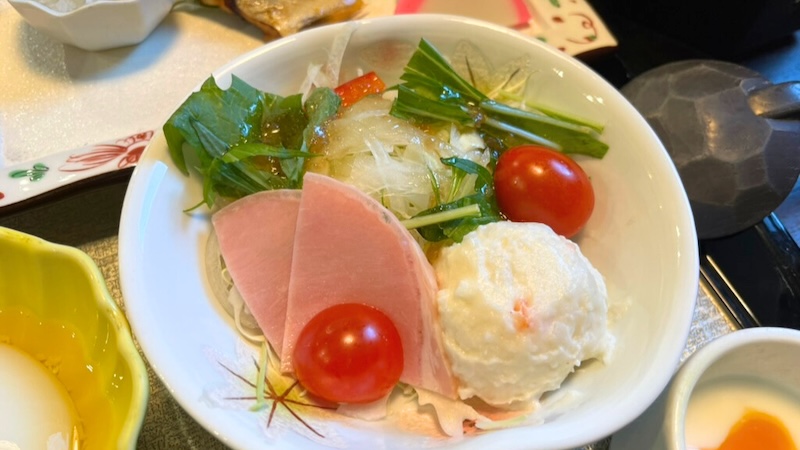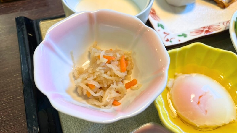 また旅館朝食の定番メニュー、切り干し大根や温泉卵もシンプルながらおいしく、どこかほっとする味。