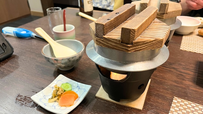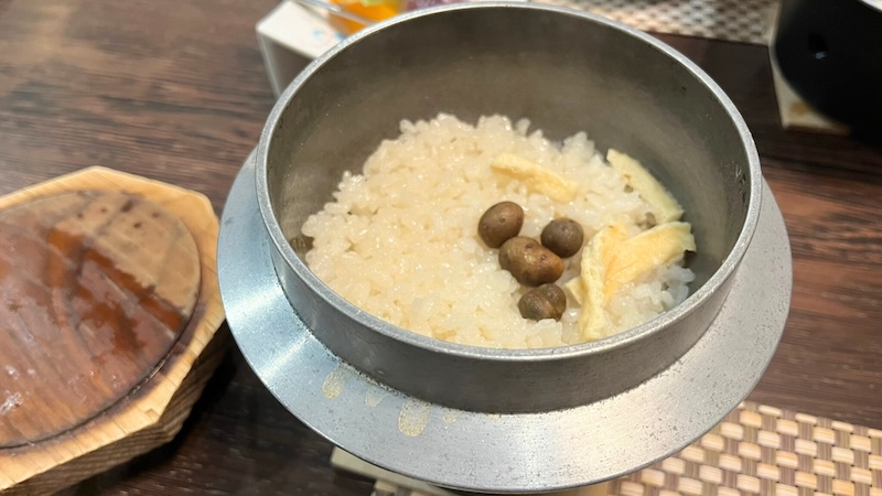 最後はご飯もの。炊き上がるまでに時間がかかるため、お釜は少し早めに持ってきてくださり、先に火をつけてくださいました。