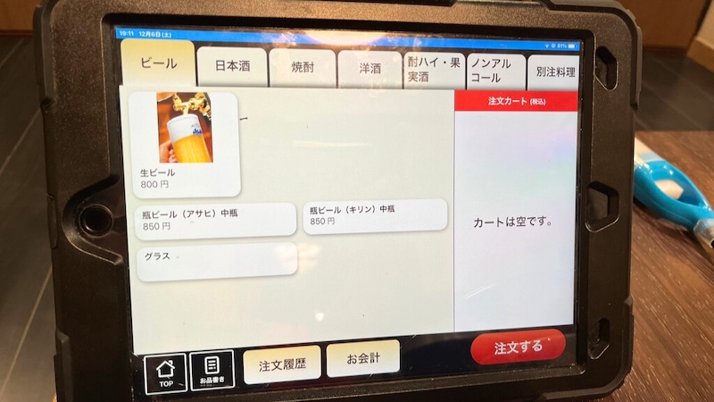 最初の1杯のみ配膳スタッフの方に伝え、その後はタブレットから注文します。