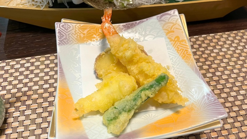 続いては揚物。えび、白身魚、さつまいも、ししとうの4種類です。