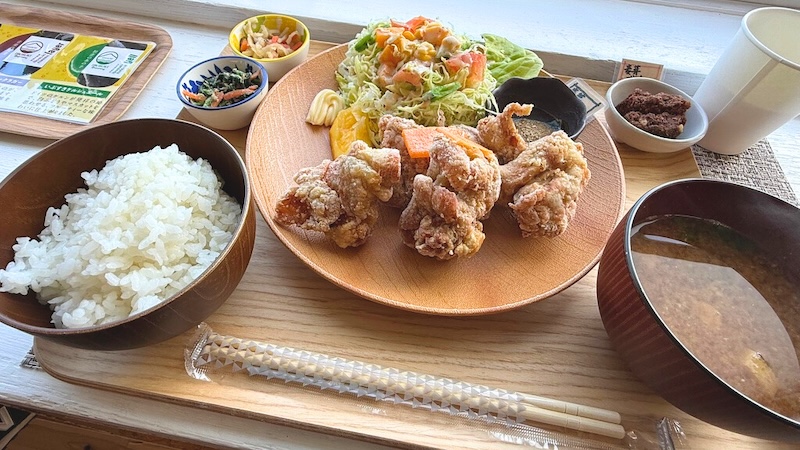 夫は唐揚げプレートを注文。こちらも付け合わせの野菜がたっぷり乗っています。