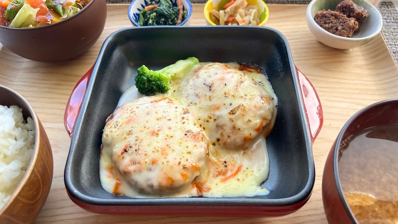 妻はハンバーグプレートをチョイス。想像していたよりかなりボリューミーで、野菜もたっぷり食べられるメニューです。