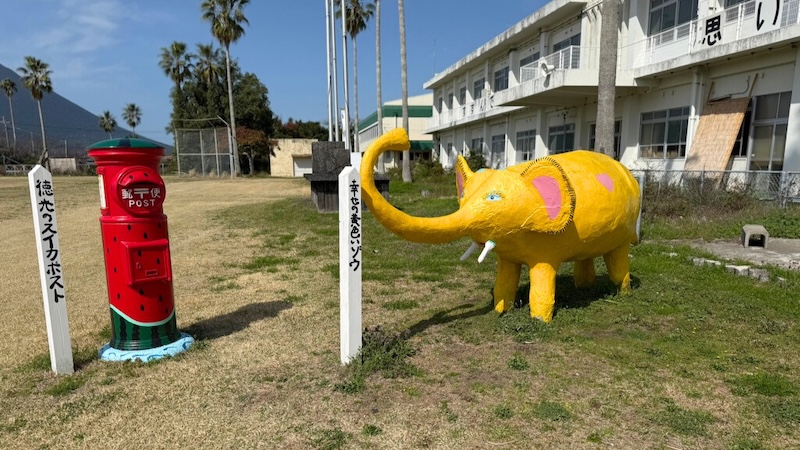 「幸せの黄色いゾウ」と地域名産のスイカをモチーフにした「徳光のスイカポスト」は、写真スポットとしてもぴったりです◎