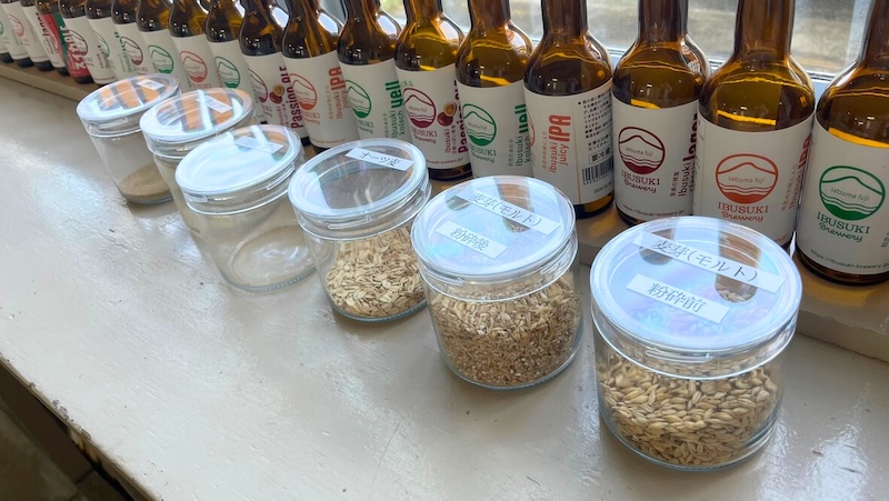 窓際の棚にはビールに使われる麦芽やオーツ麦なども展示されています。