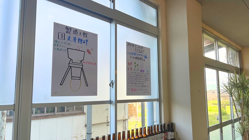 窓にはクラフトビールができるまでの製造工程が書かれた掲示も。手書きの掲示で“小学校の自由研究”のような雰囲気があるのも良いですね。
