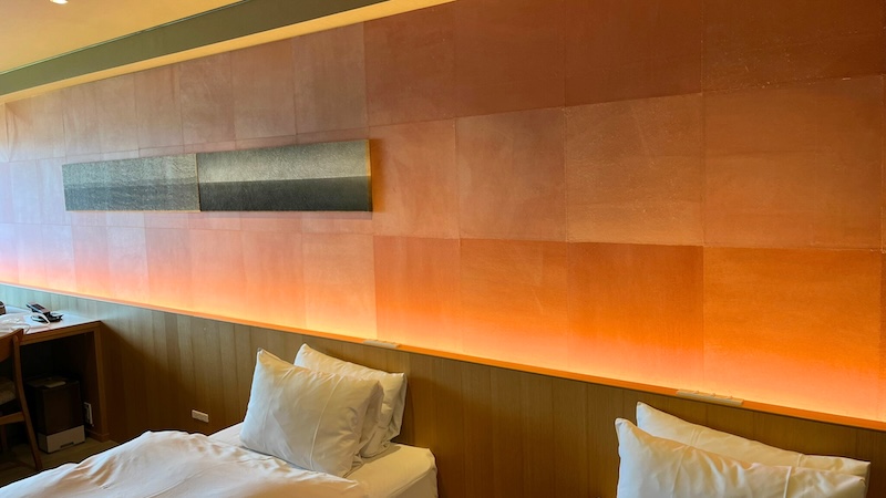 「彩海の間」として、夕日〜夜明けまで色が変化していく海をモチーフにしている客室だそう。
