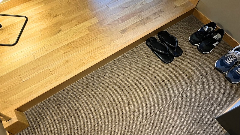 中に入ると、玄関はまずまずの広さ。中には下駄が2セット用意されています。