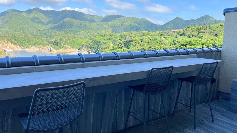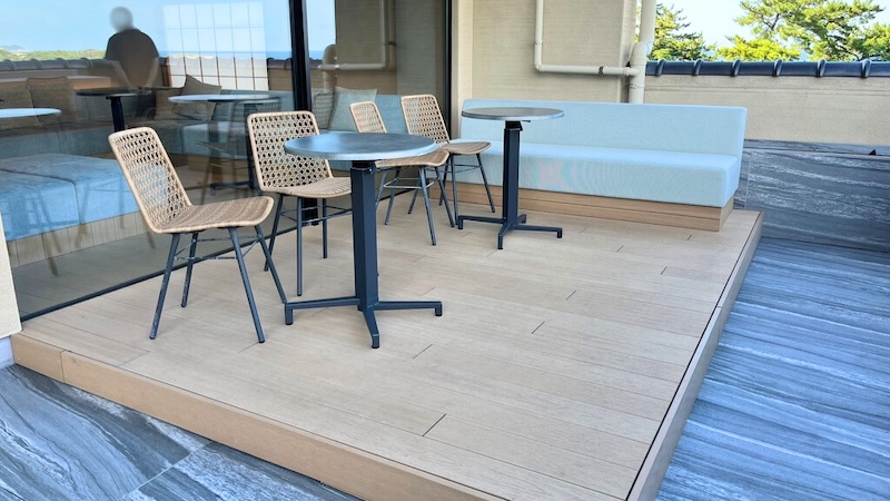 外の「かわたれテラス」に出ると、海に面したテラス席が8つほど。