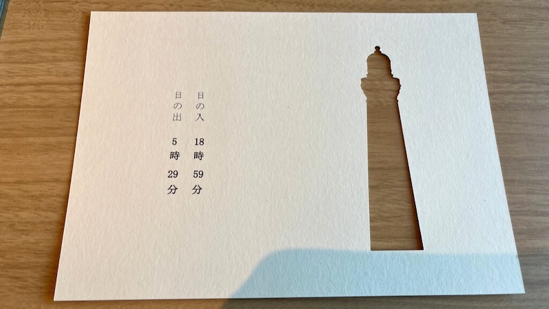 こちらのお宿には、朝日・夕日の景色を目当てに来る方も多いため、裏には日の出・日の入の時間が記載されています。