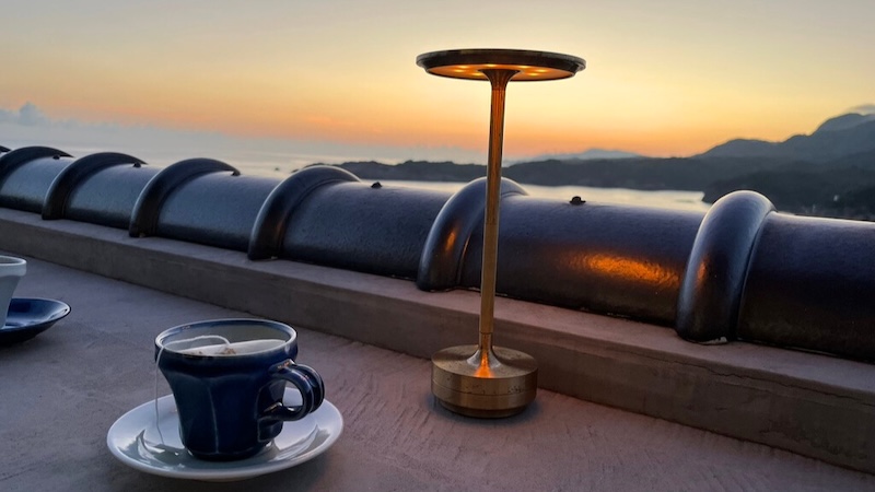 コーヒーを片手に、朝日に染まる景色を堪能できる「かわたれテラス」