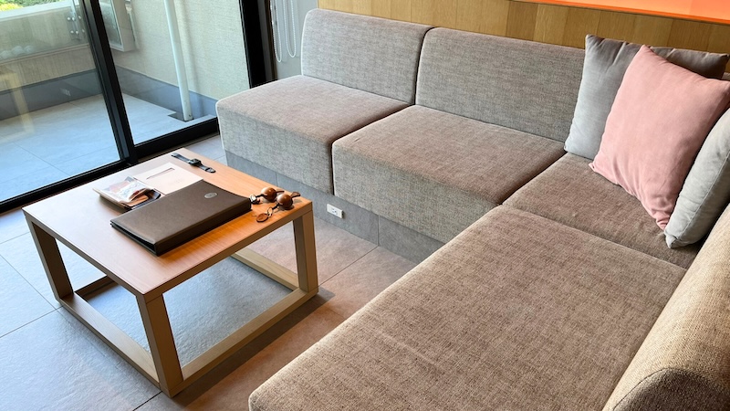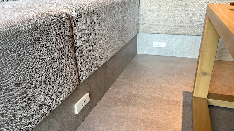 ソファーの足元にはコンセント口が2つ。こういう“痒いところに手が届く設備”はうれしいポイントです◎