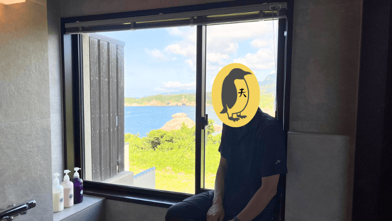 灯台側は夕日、海側は朝日の絶景を楽しめる、ピクチャーウィンドウ付きの客室