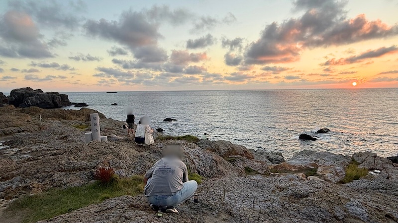 灯台の下には、日が沈む様子を見ようとする人がたくさん集まっていたため、今回は人が少ない岩場の方で楽しみました。