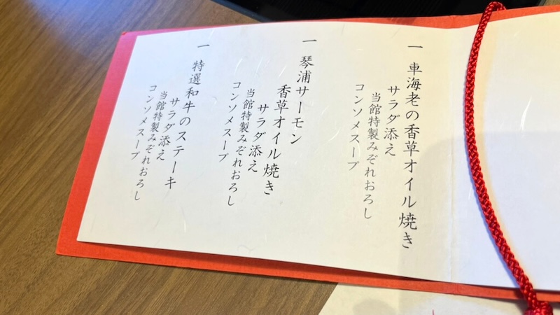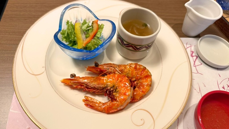 食事がスタートする前に、その日のメニューの中から好きなものを選択します。今回は車海老とサーモン、魚介の2種類を選択しました。