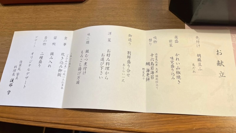 今回いただくのはスタンダードメニューの会席。