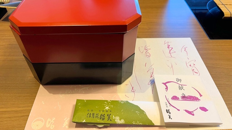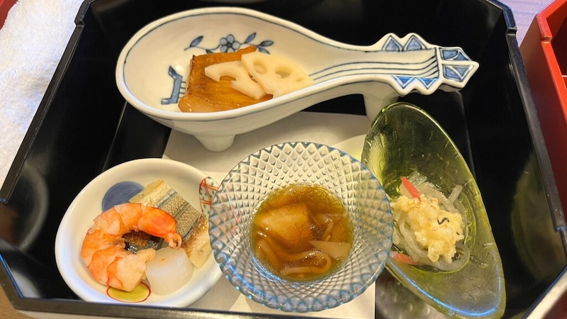 まずは先付けと前菜が入った重箱が運ばれてきました。