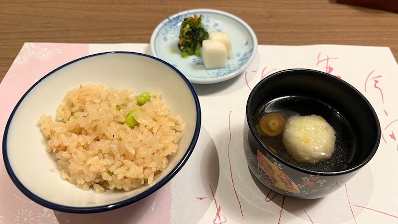 ご飯ものは枝豆と桜海老が入った炊き込みご飯。シンプルながらも旨みが詰まっており、箸が止まらないおいしさです。